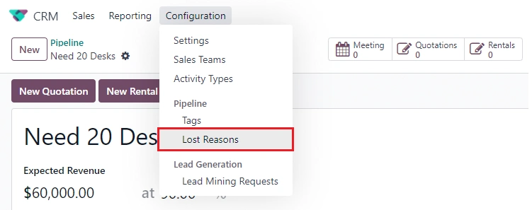 Access your Lost Reasons under Configuration > Lost Reasons. You have the flexibility to modify existing reasons or create new ones. This ensures your loss categorization aligns with your business context.